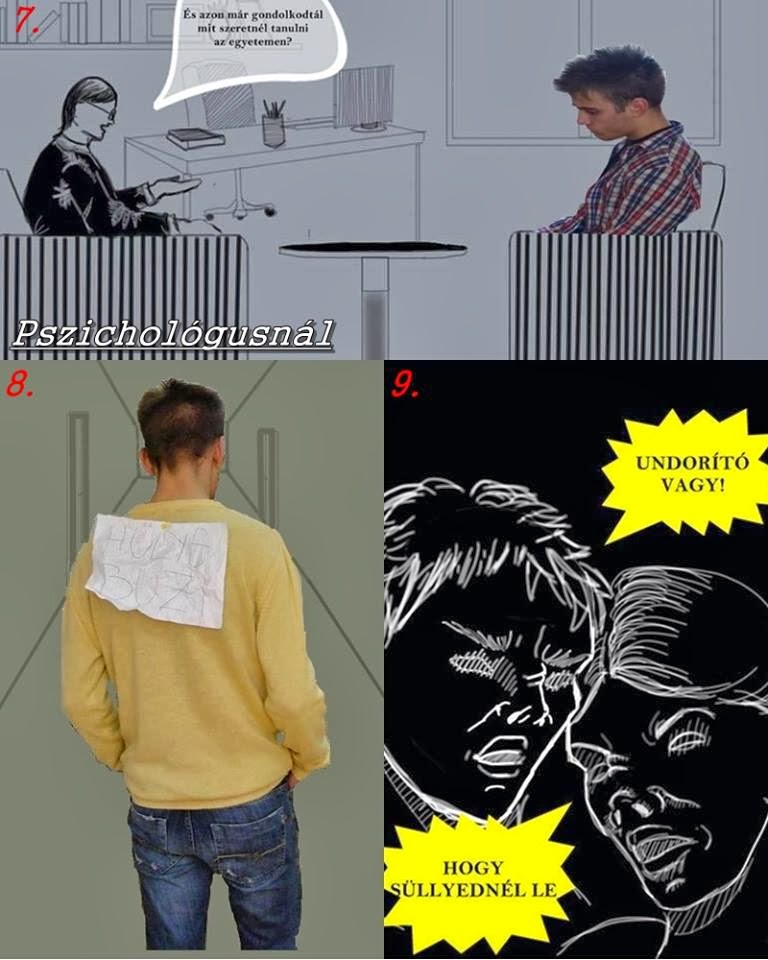 Röviden a feladatról: olyan képregényt kellett késziteni, ami egy bármilyen szempontból (pl. vallás, nemzeti hovatartozás) kirekesztett/diszkriminált/kisebbségbe szorult csoport egy létező, vagy kitalált tagjáról szól. Mi a homoszexuális kisebbséget választottuk, hiszen ez nálunk (és egyáltalán a világ egyik pontján sem) túlságosan elfogadott dolog. Útána olvastunk életünknek, beszélgettünk emberekkel, akik ebben a témában érintettek és végül sok fáradozás után, de megszületett a képregény, melyben röviden egy homoszexuális fiú egy napját meséljük el, és amit lentebb ti is megtekinthettek.